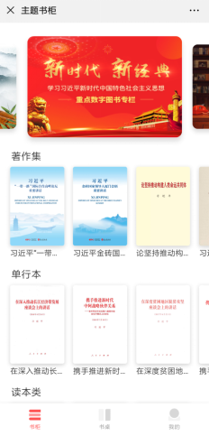 为配合“不忘初心、牢记使命”主题教育,更好满足广大干部群众对学习习近平新时代中国特色社会主义思想图书的阅读需求,中图主题书柜作为14家指定网络传播平台之一,同步上线了“新时代 新经典——学习习近平新时代中国特色社会主义思想的重点数字图书专栏”,为广大干部群众提供阅读服务。