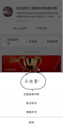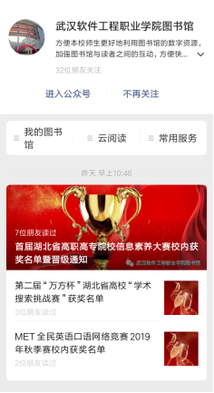 1.搜索并关注“武汉软件工程职业学院图书馆”微信公众号。
