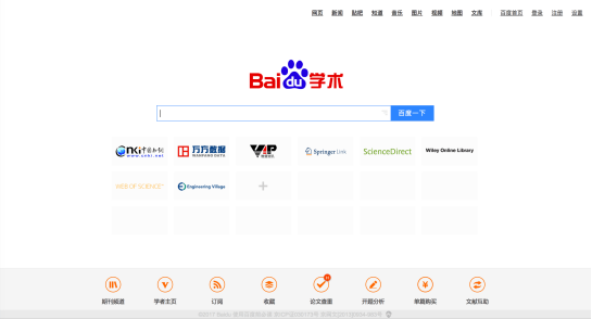 百度学术知识发现系统(百度学术),整合百度领先的资源检索技术和大数据挖掘能力,将网络中繁杂的文献信息进行筛选、排重和结构化处理,并将机构已购和自建数据库资源与百度学术海量元数据对接,使用户通过一个检索入口快速获取有序的学术信息,为机构用户提供高质量、低成本的学术资源发现和共享服务。