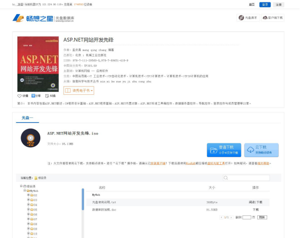 读者在摘要信息页面,通过点击资料题名或者查看详情 ,可以进入资料详细信息页面,提供光盘的在线浏览及多种下载方式(普通下载、云下载)操作。如图所示: