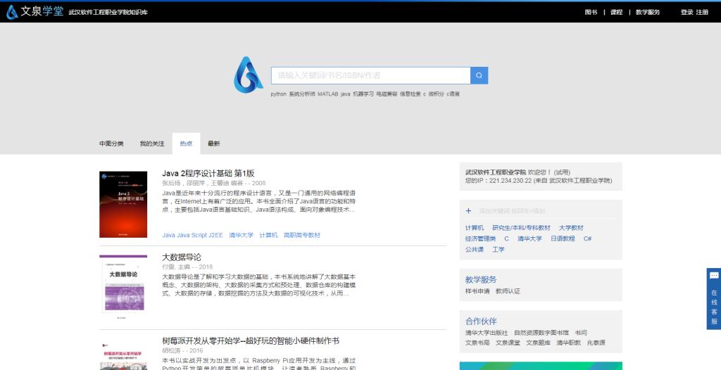 《文泉学堂》电子书知识库以清华大学出版社联合多家大学出版社近10余年的正版电子书资源为基础,聚合多媒体附件和特色课程内容资源,内嵌教师服务功能,以辅助高校“双一流”学科建设为目标,专为国内高等院校师生定制的专业知识内容资源,方便师生快捷、精准查找知识内容,高效率阅读和学习。知识库包括电子书资源超过40378种,多媒体附件和课件39589个,专业在线课程50门。