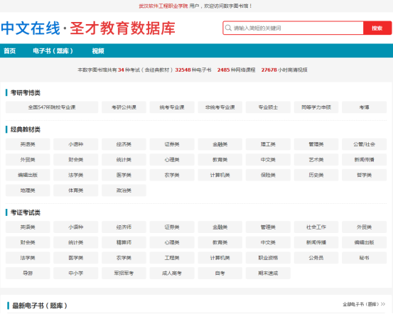 中文在线圣才电子书是专为各类专业考级、考证、考研的考试用途,以及高等教育、专业课程的学习辅导用途推出的在线数据库,是将教程资源、题库资源与视频资源融为一体的专业服务体系。产品覆盖专业与类别齐全,涉及全国500多所院校考研专业课、200多种资格职称类考试、近1000种经典教材辅导。包括10万种教辅电子书、2万多种考研全套资料、500种教辅图书、2万多小时高清视频(2000多种课程)、1600多万道试题(3000多种题库)。