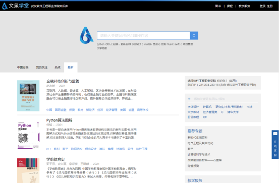 《文泉学堂》电子书知识库以清华大学出版社联合多家大学出版社近10余年的正版电子书资源为基础,聚合多媒体附件和特色课程内容资源,内嵌教师服务功能,以辅助高校“双一流”学科建设为目标,专为国内高等院校师生定制的专业知识内容资源,方便师生快捷、精准查找知识内容,高效率阅读和学习。知识库包括电子书资源超过超过5万种,在线标准课程50门。