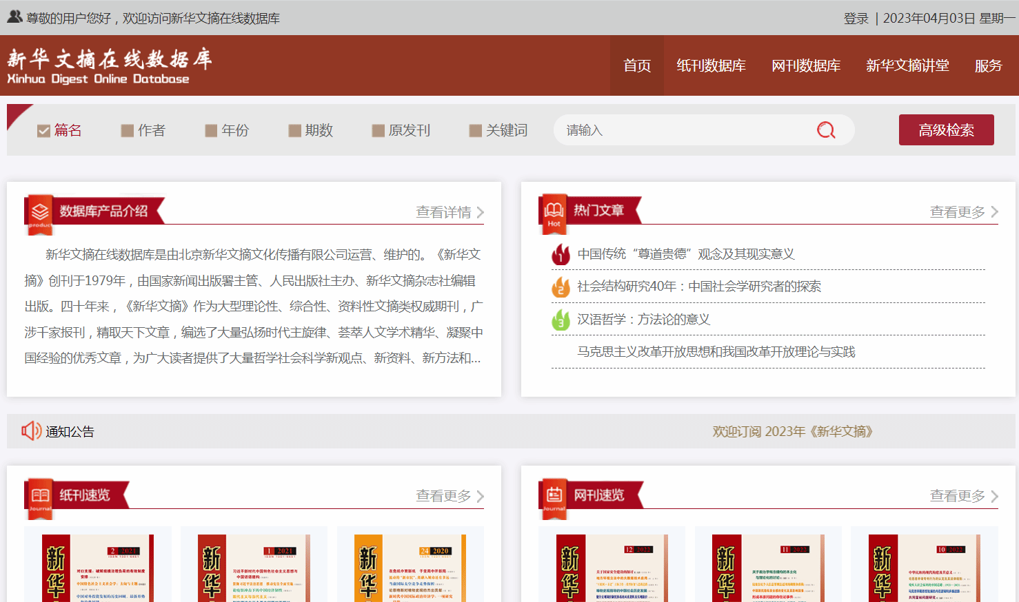“新华文摘数据库”收录了自1979年创刊以来的《新华文摘》杂志内容,共计708期(截至2020年24期,之后会陆续更新)、36000余篇、3亿字左右;另有网刊138期、13000余篇、1.6亿字左右。内容涵盖政治、经济、文化、社会、科技等领域,方便读者广泛了解、深入把握哲学社会科学理论学术前沿、热点及动态。