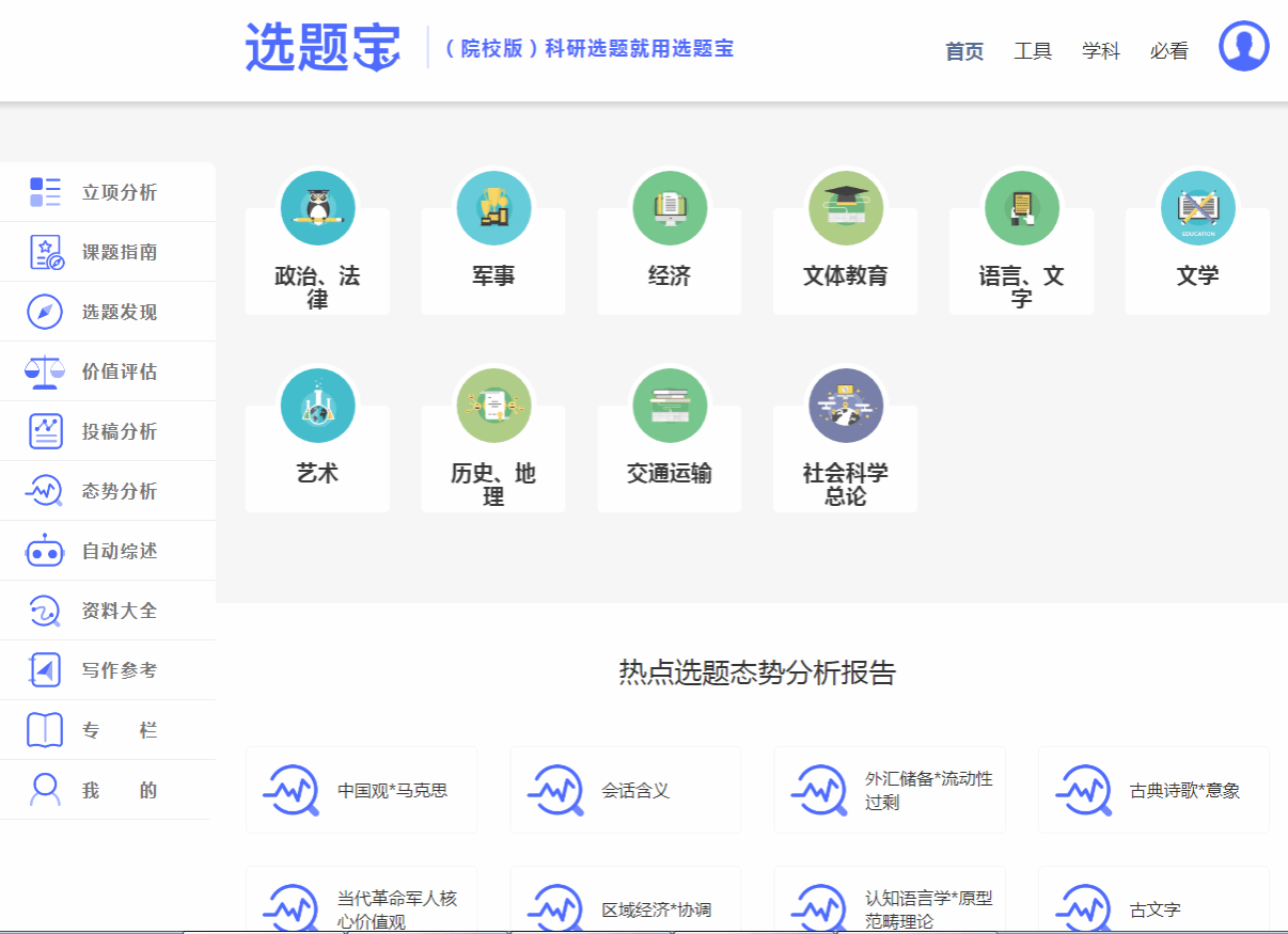 选题宝人文社科大数据分析服务平台通过大数据挖掘和知识图谱技术,提供选题发现、价值评估、态势分析、自动综述、投稿分析、立项分析等功能;常设各学科热点选题专栏,定期更新各级各类课题招标信息、会议征稿等科研资讯。